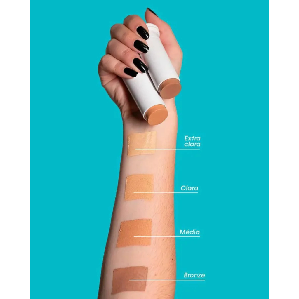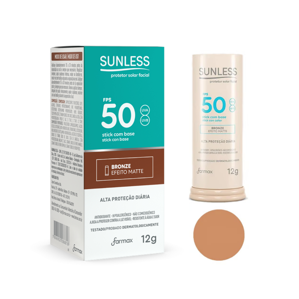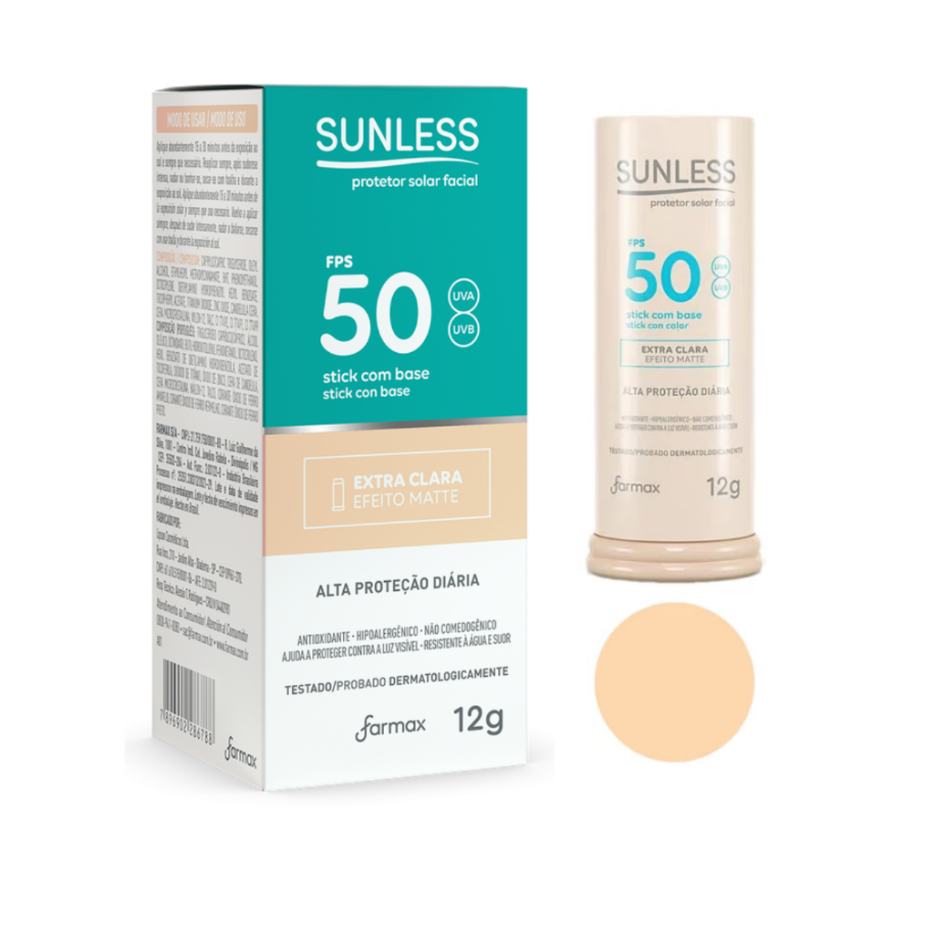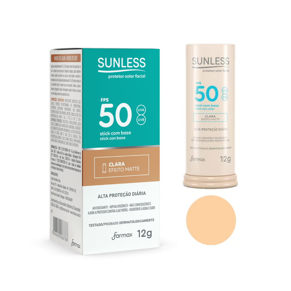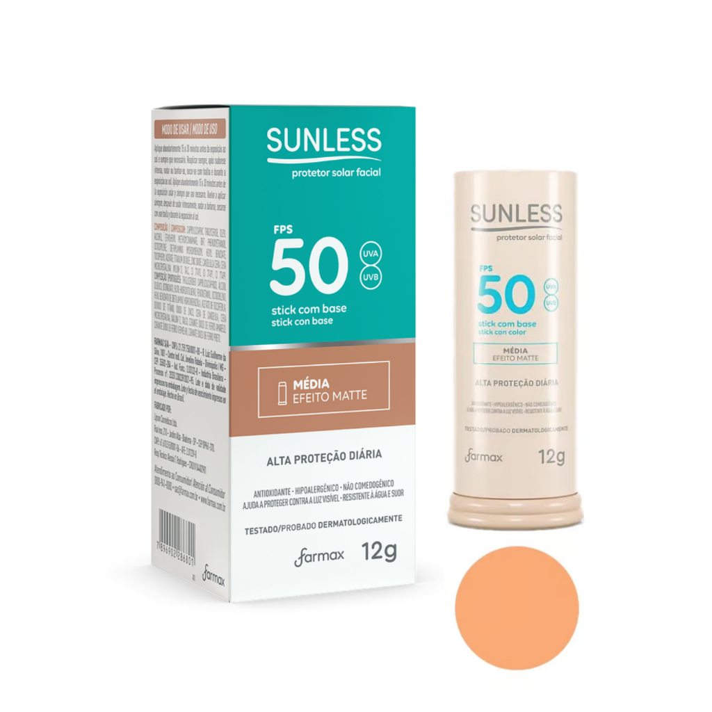 O Protetor Solar Stick com Base Média Sunless 12G proporciona alta proteção contra os raios UVA e UVB por conter FPS 50 e filtros foto estáveis em sua fórmula, sendo indicado para pele muito sensível à queimadura solar. Com composição hipoalergênica, não comedogênica e multifuncional, sua fórmula em base tem efeito matte e promove alta cobertura, disfarçando imperfeições da pele.